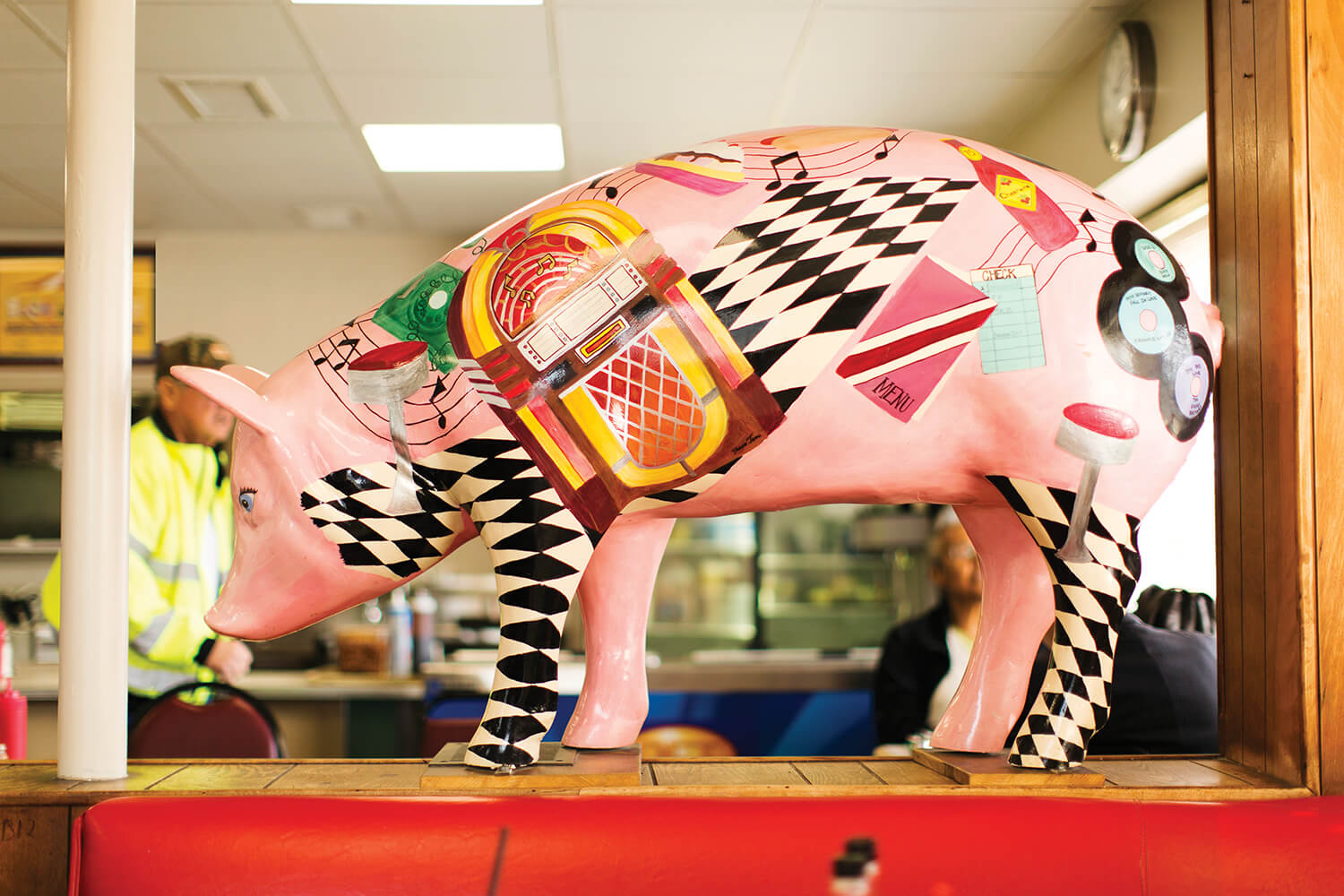 We sit in a booth big enough to accommodate the Walton family. Behind us is a life-size pig statue decorated with a jukebox and 45s. The decor is splashed with ads for Lexington’s Barbecue Festival: the 26th annual, the 27th annual, the 28th annual, the 29th …