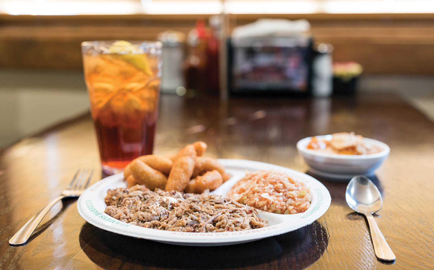 The interior walls, wood-paneled and glossy, lend a den-like coziness to the atmosphere, and I sit down as the lunch crowd shuffles out. I already know what I want: the large barbecue plate with slaw, potato salad, and hush puppies.