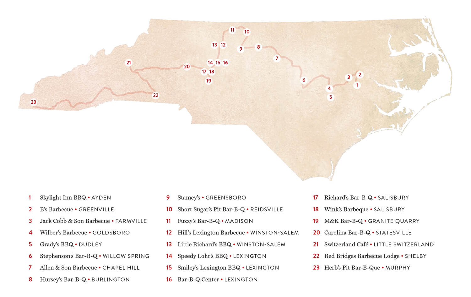 Food, like accents and architecture, creates a sense of place. North Carolina is a populous place, laced with interstates, where plenty of franchised entrées are served exactly as they are in Buffalo, New York, or Boise, Idaho. To know the soul of North Carolina, hit the trail and head for the pits.