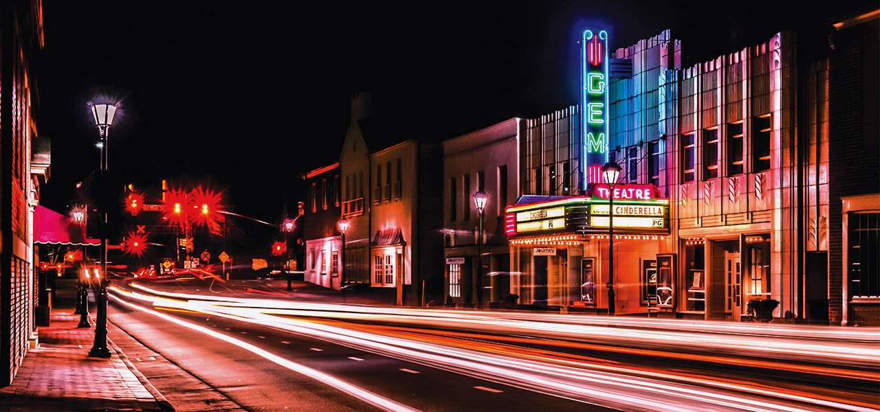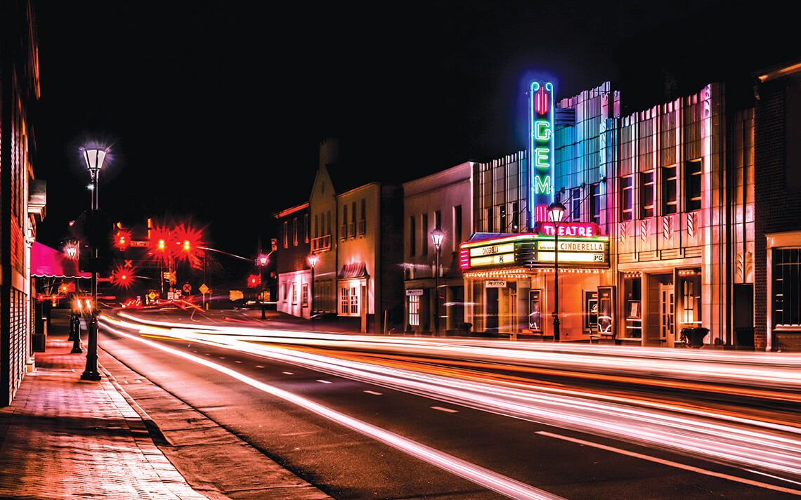 Before televisions were commonplace, the 1936 Gem Theatre was a primary source of entertainment in Kannapolis. Live acts featuring entertainers like Western star Roy Rogers and his horse, Trigger, would kick off the show. Then, the screen would roll down, and the picture would begin. Movies were promoted with elaborate displays staged around the marquee, like military Jeeps parked outside when war pictures were shown. In 1942, the back portion of the Art Deco building was destroyed by fire, but the facade, lobby, and projection room were saved, and the marquee remains almost identical to the way it appeared in 1936. While modern companies have proposed changing out the neon lights for more cost-effective LED bulbs, General Manager Steve Morris believes that nothing can replicate the brilliant color — and the nostalgic buzz — of real neon. “We’ve seen so many other things [in Kannapolis] change and go away,” he says. “But this is the one place that has been frozen in time.”