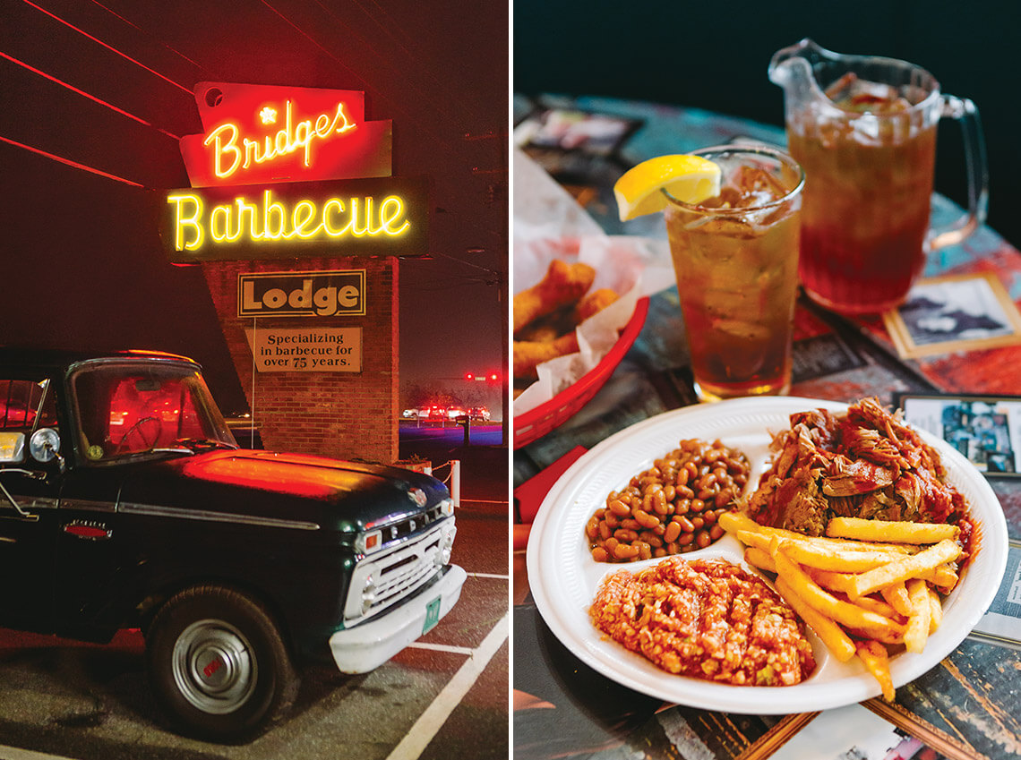 Over the years, celebrities who’ve eaten the famous pulled pork and red slaw at Red Bridges Barbecue — including Richard Petty and Billy Graham — have posed for a photograph with the restaurant’s neon sign. photographs by Joshua Vasko