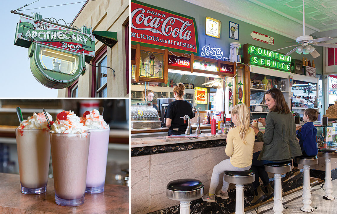 Home to the first — and only remaining — soda fountain in Hendersonville, Mike’s on Main still sports the original wood cabinets and ornate ceilings that the building featured when it opened as Justus Pharmacy in 1900. Owner Patty Adamic creates a nostalgic feel that harks back to the days of soda jerks and sock hops: A 1950s-style jukebox in the back corner plays classics by Elvis, Patsy Cline, and Nat King Cole. The menu offers long-popular beverages like Cheerwine, root beer floats, and old-fashioned ice cream sodas. And neon signs hang above the front door and over the counter inside. Today, Mike’s on Main remains a gathering place for Hendersonville, just as soda fountains were for towns across America in decades past.
