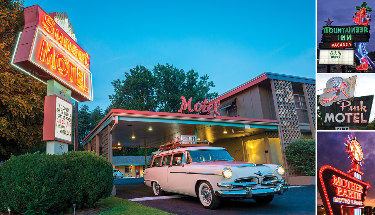 Brevard’s Sunset Motel sign, prized for its vintage look, was once featured in a Marlboro ad, as well as in a music video by western North Carolina singer-songwriter Nikki Talley. photographs by EMILY CHAPLIN, ROADSIDEARCHITECTURE.COM, BAXTER MILLER