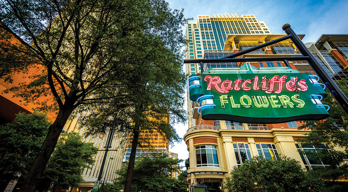 In a city that’s ever-changing, the Ratcliffe’s Flowers sign has shone on Tryon Street for nearly a century. Crafted by Ernest Grady, a statewide pioneer in the art of neon, the Art Deco-style sign was installed in 1929 on a new building commissioned by Louis Ratcliffe Sr. during Charlotte’s building boom. Neon signs continued to pop up in the area, but as change continued into the 1960s, many businesses agreed to remove them in favor of more modern designs. Louis Ratcliffe Jr., who had taken over his father’s shop, refused to take his down. “At that time, it was just another sign that downtown business associations wanted gone,” says Christopher S. Lawing, founder of the Charlotte Signs Project, which documents and preserves the city’s historic signage. “Today it is hailed as a beautiful piece of cultural art.” Ratcliffe’s closed in the 1980s, but the sign remained. In 2000, the building was relocated, and the sign was later removed, restored, and reinstalled at 431 South Tryon Street, where it was honored with a relighting ceremony.