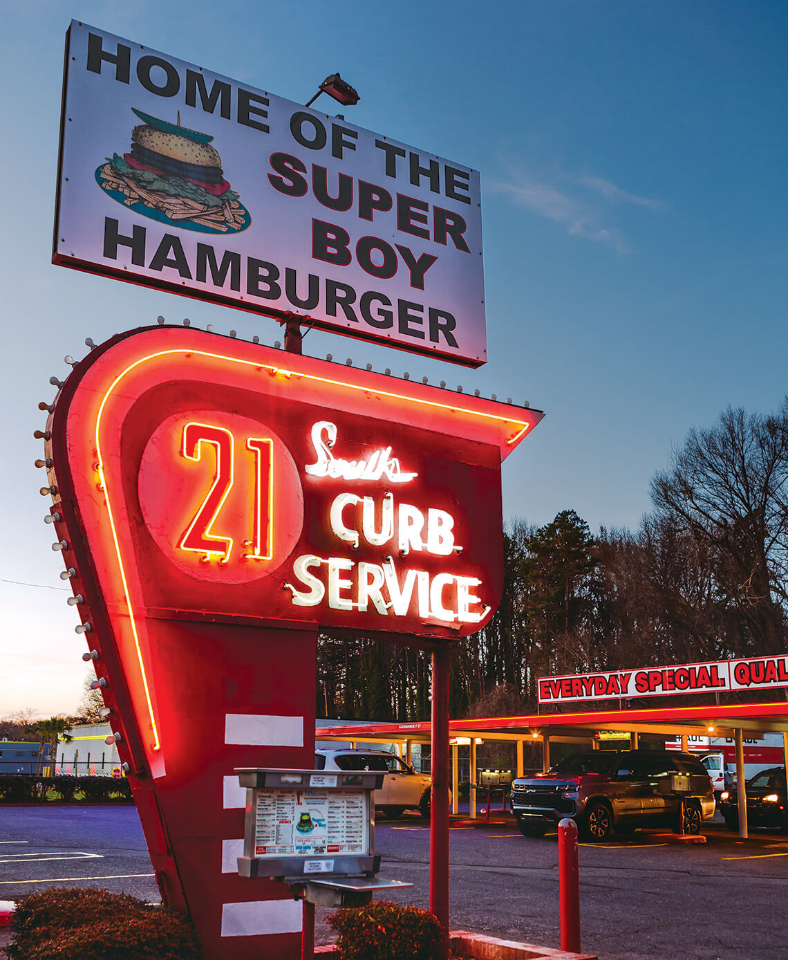 Like the neon signs that once drew hungry customers to drive-in restaurants across the state, the days of driving up, honking your horn, and having a carhop appear at your window have all but disappeared. But at South 21, customers find a neon sign promising all of that plus the Super Boy, a double hamburger with mustard, onions, lettuce, and tomato. Owner George Housiadas, along with his longtime customers, sees the sign at his 1950s burger joint as a symbol of the restaurant’s longevity — and of the ’50s and ’60s.