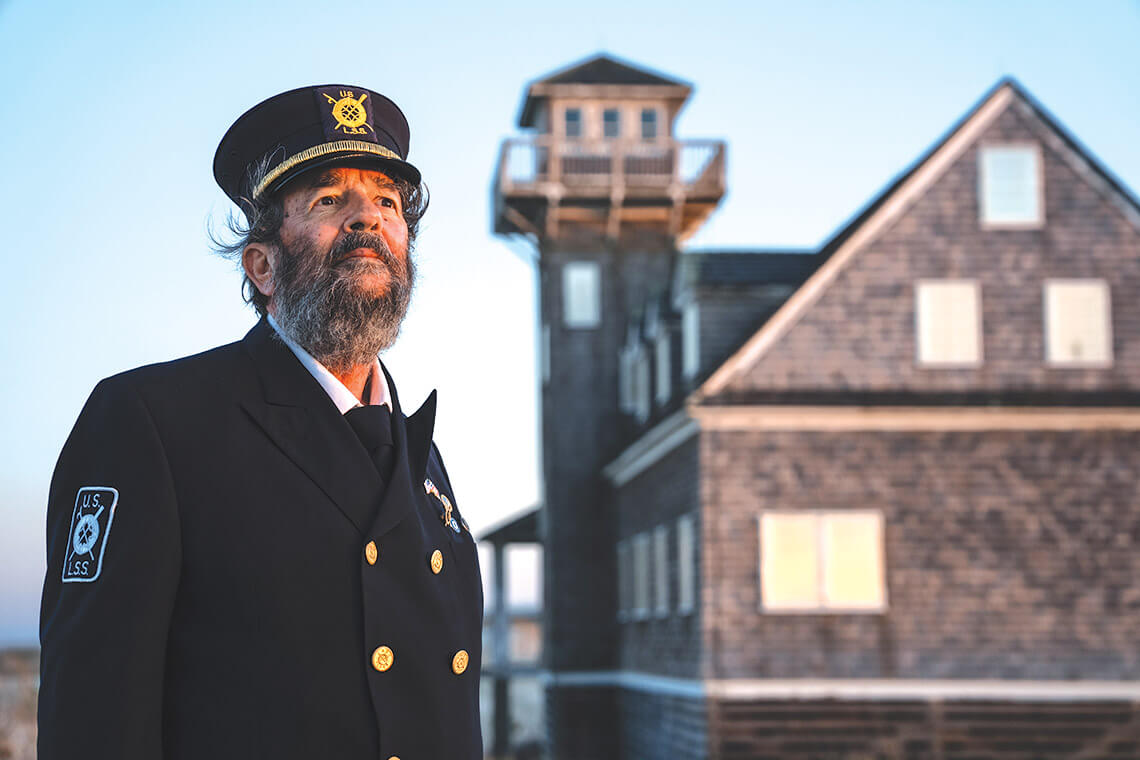 Nearly 125 years after the wreck of the Aaron Reppard, historian James D. Charlet recounts the harrowing events as if he were there. Known to many as Keeper James, Charlet dresses in period garb — a brass-button vest and navy-blue jacket paired with a matching hat displaying an embroidered USLSS emblem. He sometimes even slips into first person while telling tales of his heroes, who were referred to in the headlines of their day as “storm warriors” or “soldiers of the surf.”