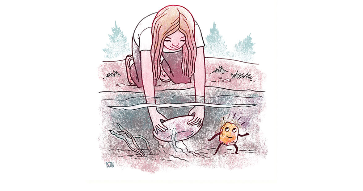 As I shake and slosh a pan full of pebbles in Betty McGee Creek, Casey tries to catch a frog among the water lilies. For a second, I consider telling her that “to catch a frog, you have to think like a frog.” But I resist.