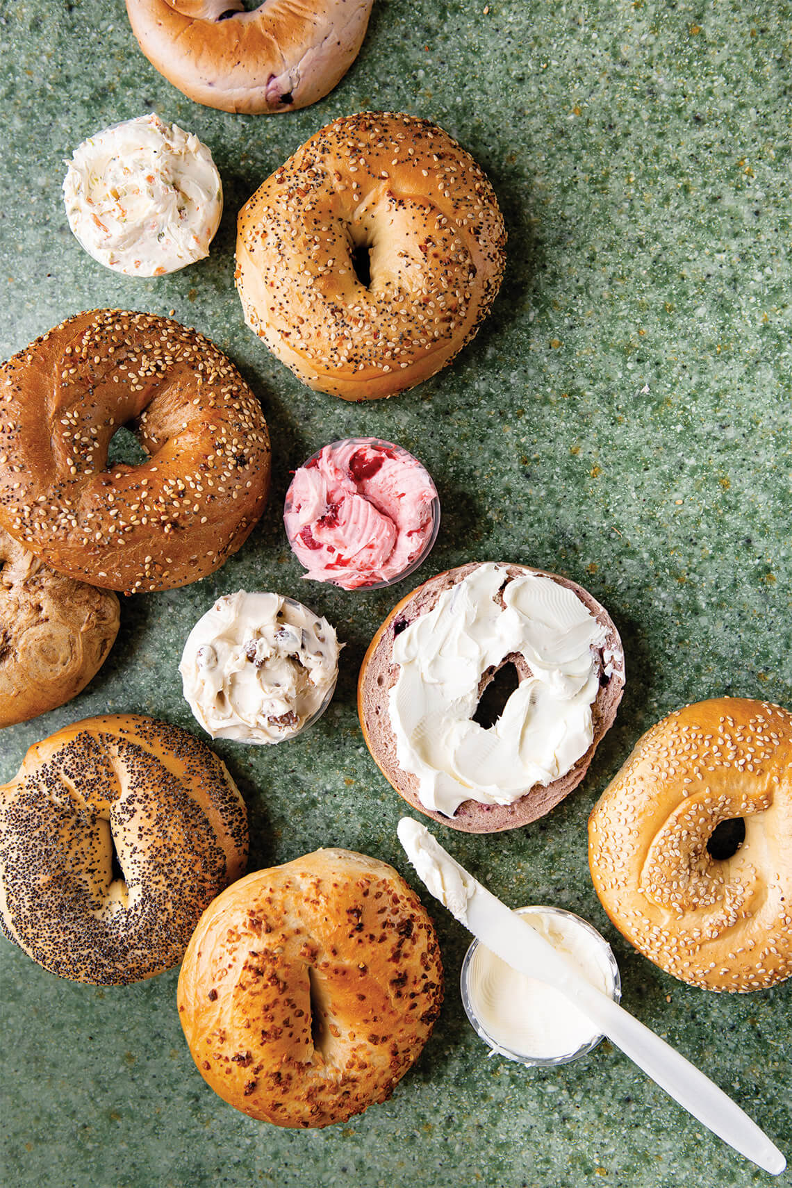 Boone Bagels come in all flavors. Clockwise from top left: “everything,” blueberry, sesame seed, garlic, poppy seed, and cinnamon raisin. Try one with a shmear of walnut raisin, strawberry, or plain cream cheese. photograph by Tim Robison
