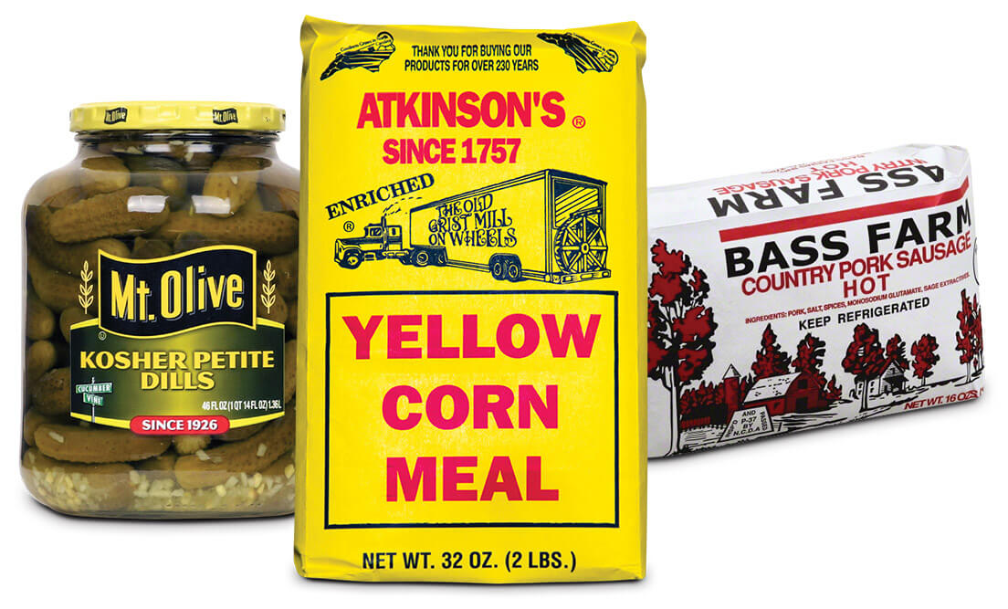 A hanging chalkboard lists per-pound prices for slab bacon, pickled eggs, country Cheddar, and red franks. Nostalgic offerings like boiled peanuts, Duke’s mayonnaise, and Mrs. Campbell’s Chow Chow from Golding Farms in Winston- Salem line the shelves. Folks with a hankering for grits can choose from Lakeside Yellow Grits, milled in Spindale, or Water Ground Style Moss Yellow Grits, from Kittrell. Luck’s, founded in Seagrove, supplies the black-eyed peas, fried apples, and chicken and dumplings.