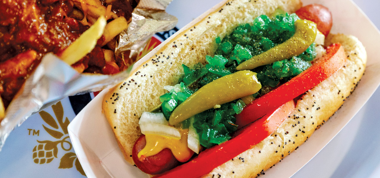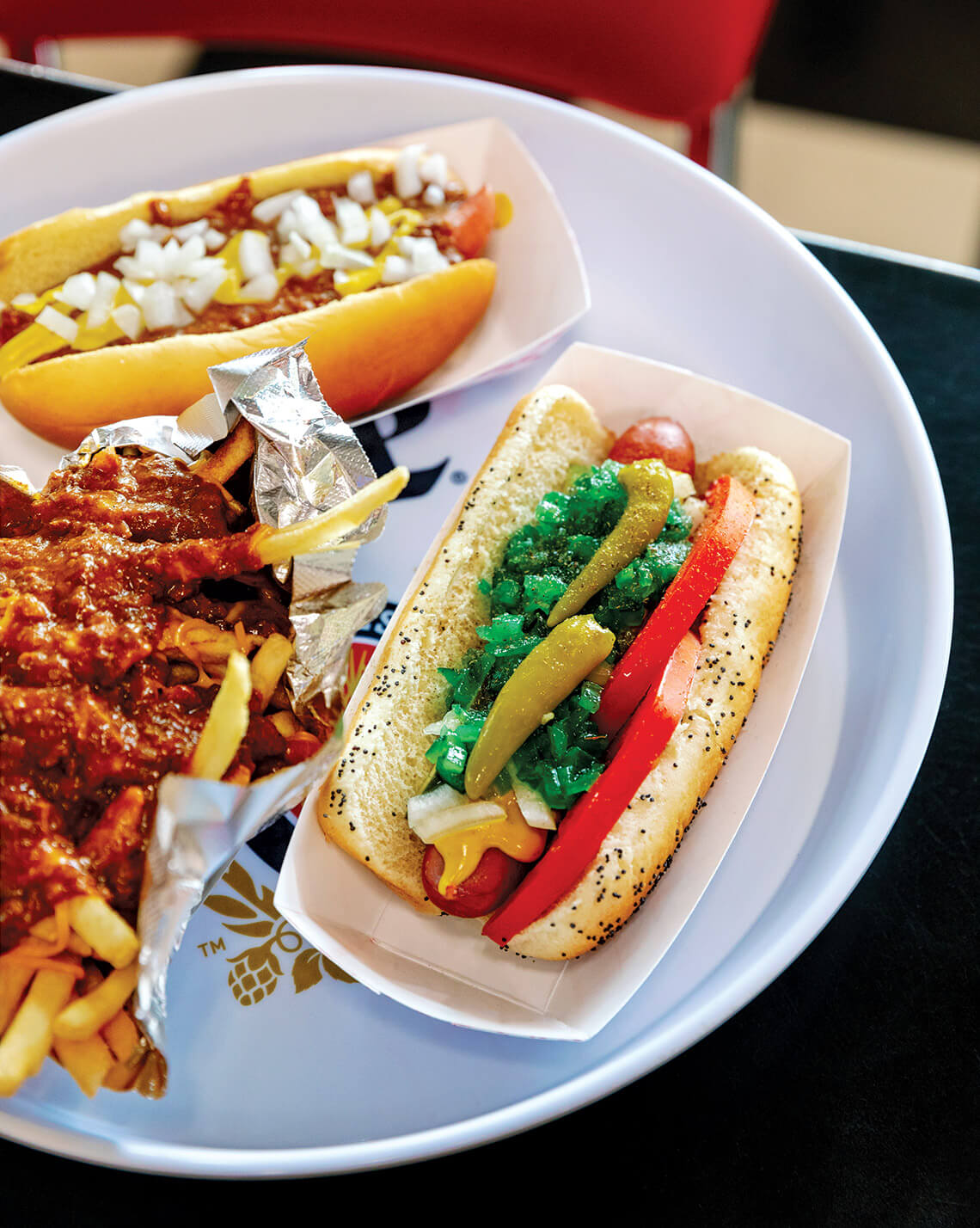 Cloos’ Coney dog (top) comes with chili, onions, and mustard; its Chicago dog is packed with tomatoes, relish, and peppers. And don’t forget the chili cheese fries. photograph by Anna Routh Barzin