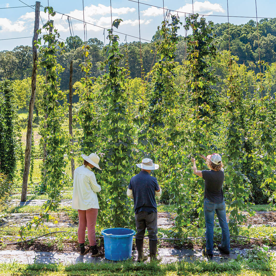 The sun creeps out from behind the clouds to warm a gentle slope on the edge of a mountain valley in Etowah, 30 minutes south of Asheville. Chickens, ducks, goats, and sheep nibble and wander under the watchful gaze of a Great Pyrenees named Winter. Below their feet, dormant in the soil, rests one of the most exciting new crops in North Carolina: hops.