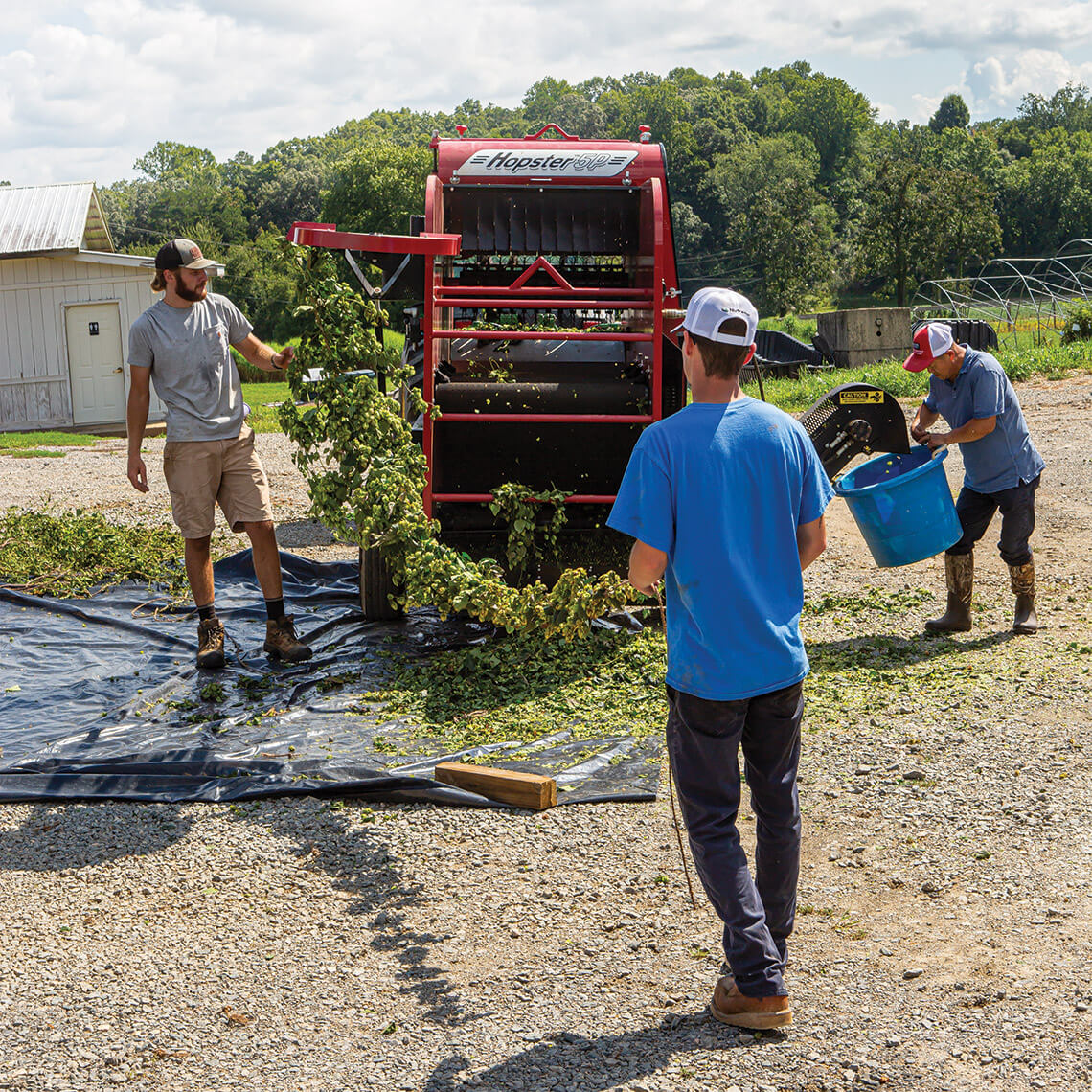 Hops go from bine to bucket. photograph by Tim Robison
