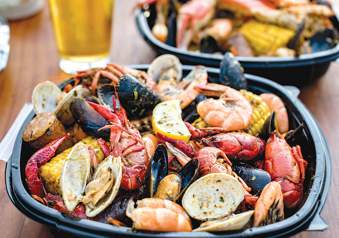 Owners Randy and Nancy Swanson’s Low Country boil might include crawfish, clams, shrimp, and mussels, plus corn, potatoes, and sausage. photograph by Charles Harris