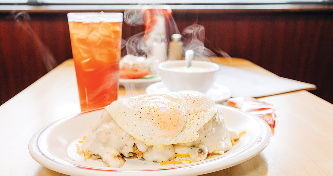 Old Bridge Diner keep the locals and vacationers fed with popular dishes like the Loaded Biscuit, topped with sausage, hash browns, Cheddar, gravy, and eggs. photograph by Matt Ray Photography