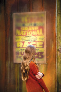 Cameron Bublitz looks at an old poster advertising a Grand National event; it’s bolted to a metal fence around the speedway trail’s western border. photograph by Andrew Kornylak
