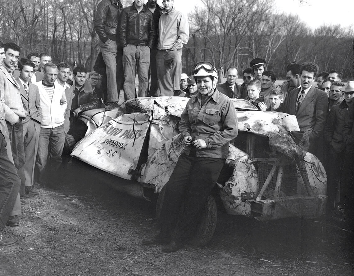Early female racer Louise Smith posed in front of her crumpled car after one of her many dramatic crashes at Occoneechee. photograph by RacingOne/ISC Archives/Getty Images