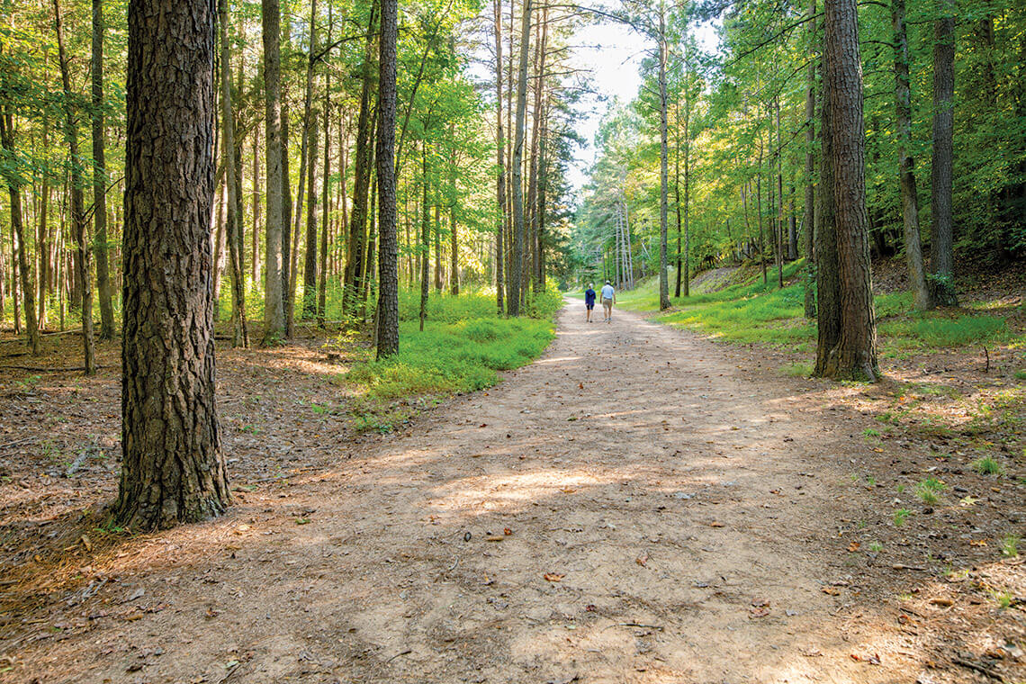 In 1985, Richard Jenrette bought and fixed up Ayr Mount, an estate that includes a Federal-era home built in 1815. The property sits on the north side of the Eno, and in the late 1990s, the owners wanted to make sure that the view from the estate would remain pristine. So they looked at buying the property across the water and discovered the remains of the old speedway out there in the woods. They convinced the France family to sell the property, then created a nature preserve and a walking path through the forest. The trail system was connected to the two-mile-long Riverwalk that leads downtown, and the Mountains-to-Sea Trail was rerouted across the Occoneechee property.