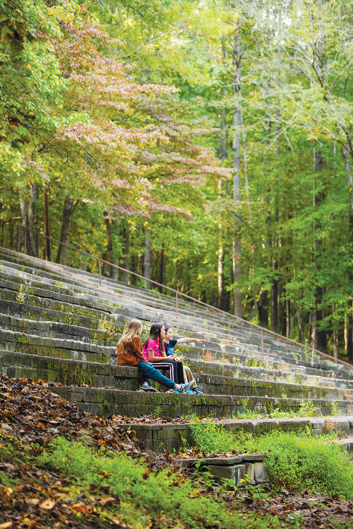 Friends Cameron Bublitz, Rebecca Kornylak, and Theo Kornylak rest on the old grandstand where spectators once watched races. photograph by Andrew Kornylak