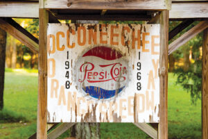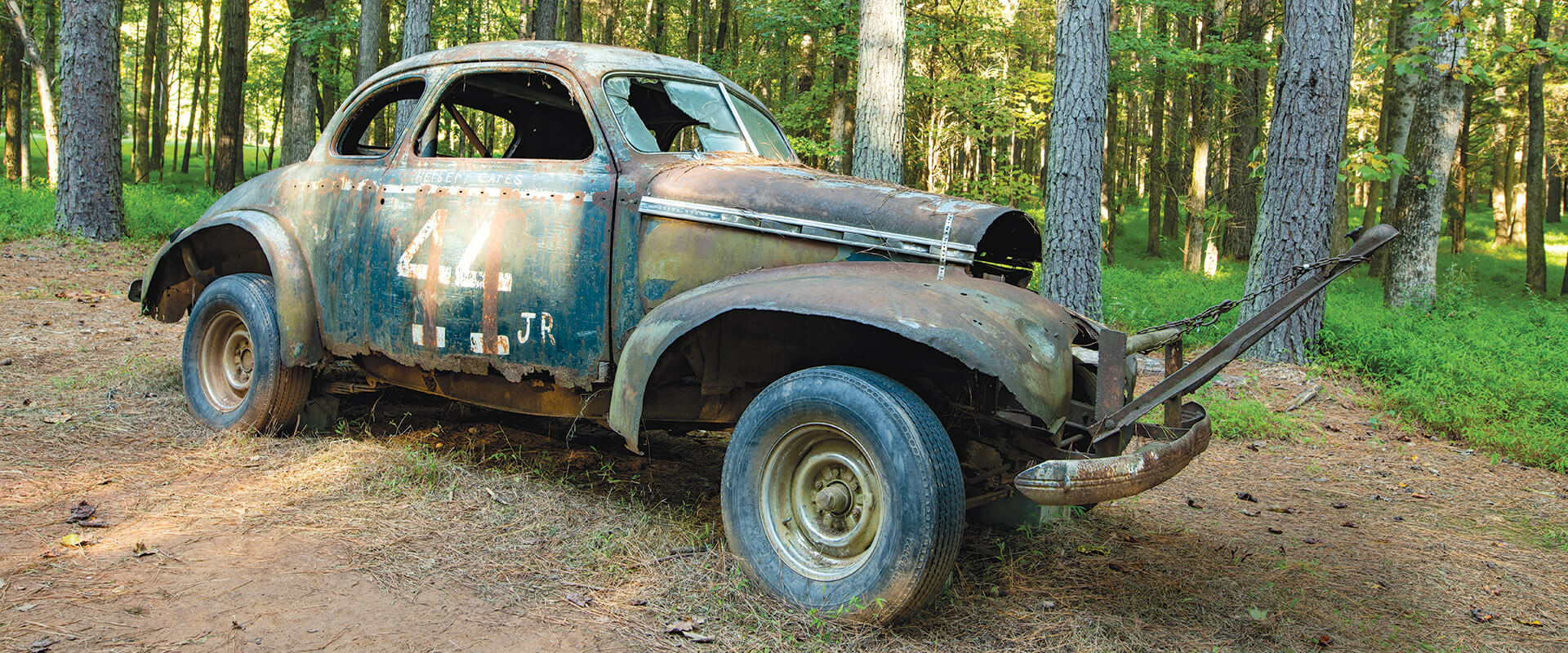 Yes, it is hard to square these two stories about the same place: one of a family gently treading across a quiet, serene spot; the other of a hard-charging woman who turned her car into an airborne mass of scrap metal for a crowd of rabid race fans. At Occoneechee, past and present don’t so much collide as they sort of intermingle. Sometimes, a few old cars return for a parade, but nobody’s turning laps here at any significant speed. Sure, there are overt nods to history at the speedway. The old buildings are authentic. The flag stand and rusty race cars were added to provide a little racetrack feng shui. But the sight lines have long since vanished. Pine, poplar, and beech trees have taken over.