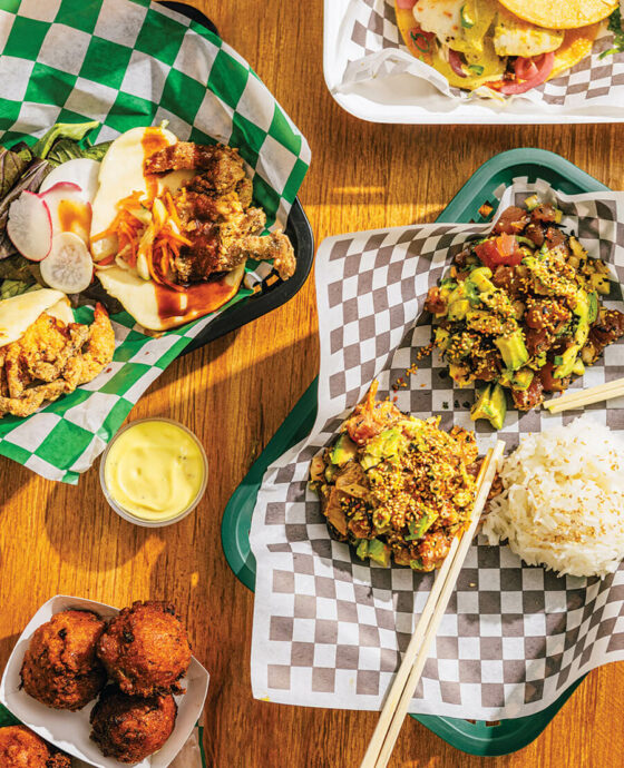 It’s always a challenge to choose from Chef Mark Newsome’s diverse range of traditional and innovative seafood preparations. Will it be a Southern-fried seafood basket or an Asian-inspired crispy fried shrimp and rice noodle bowl? Authentic Hawaiian-style poke (hands-down a house favorite) or fish tacos? Even the sides play on the idea of old-school versus new-school flavors: Korean chili paste collards or Southern-style coleslaw? Plain hush puppies or Mattamuskeet blue crab hush puppies with malt vinegar aioli?