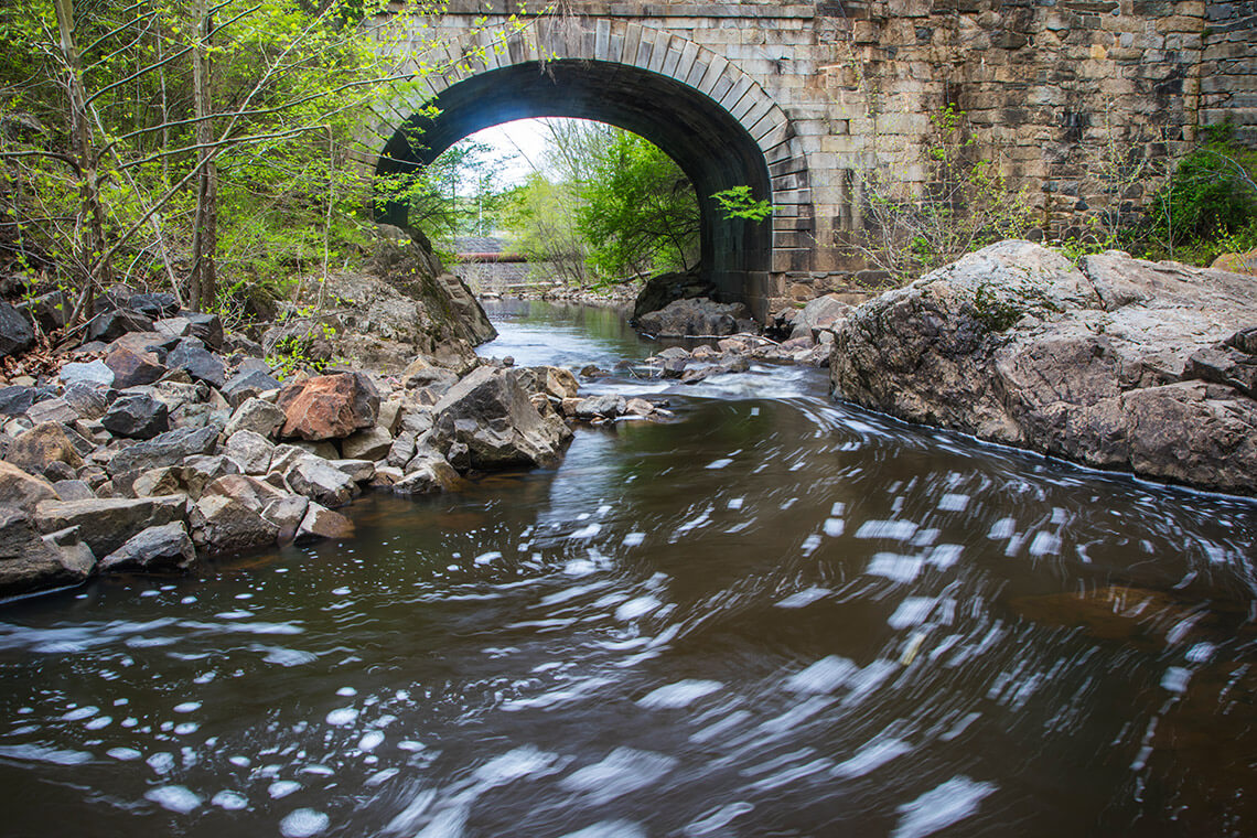 The old 110-foot Chockoyotte Aqueduct, held high above Chockoyotte Creek by a single elliptical arch with a 30-foot span, is part of the Roanoke Canal Trail. Photography courtesy of Visit Halifax