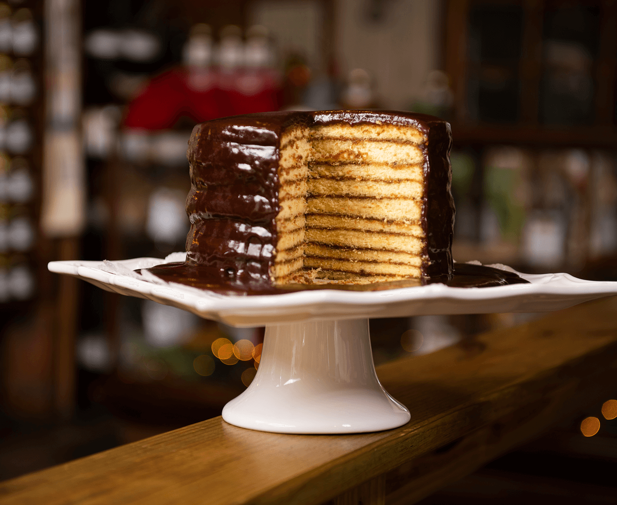 And don’t skip the famous 10-layer chocolate cake. “Everybody wants the yellow inside and that homemade gooey chocolate icing,” Lowe says. “I remember my mama made that frosting, and we would sop it up with homemade biscuits. That was a treat for us back then, and it’s that same frosting on our cakes.”