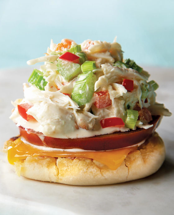 In a large bowl, combine the mayonnaise, lemon juice, salt, and cayenne pepper. Fold in the crab, red pepper, onions, and celery. Place a cheese slice on top of each English muffin half, followed by a tomato slice, followed by a generous scoop of crab salad.