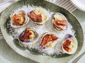 Decadently dressed clams roast under a blanket of garlic butter, Swiss cheese, and bacon for a sophisticated appetizer requiring minimal time and ingredients.