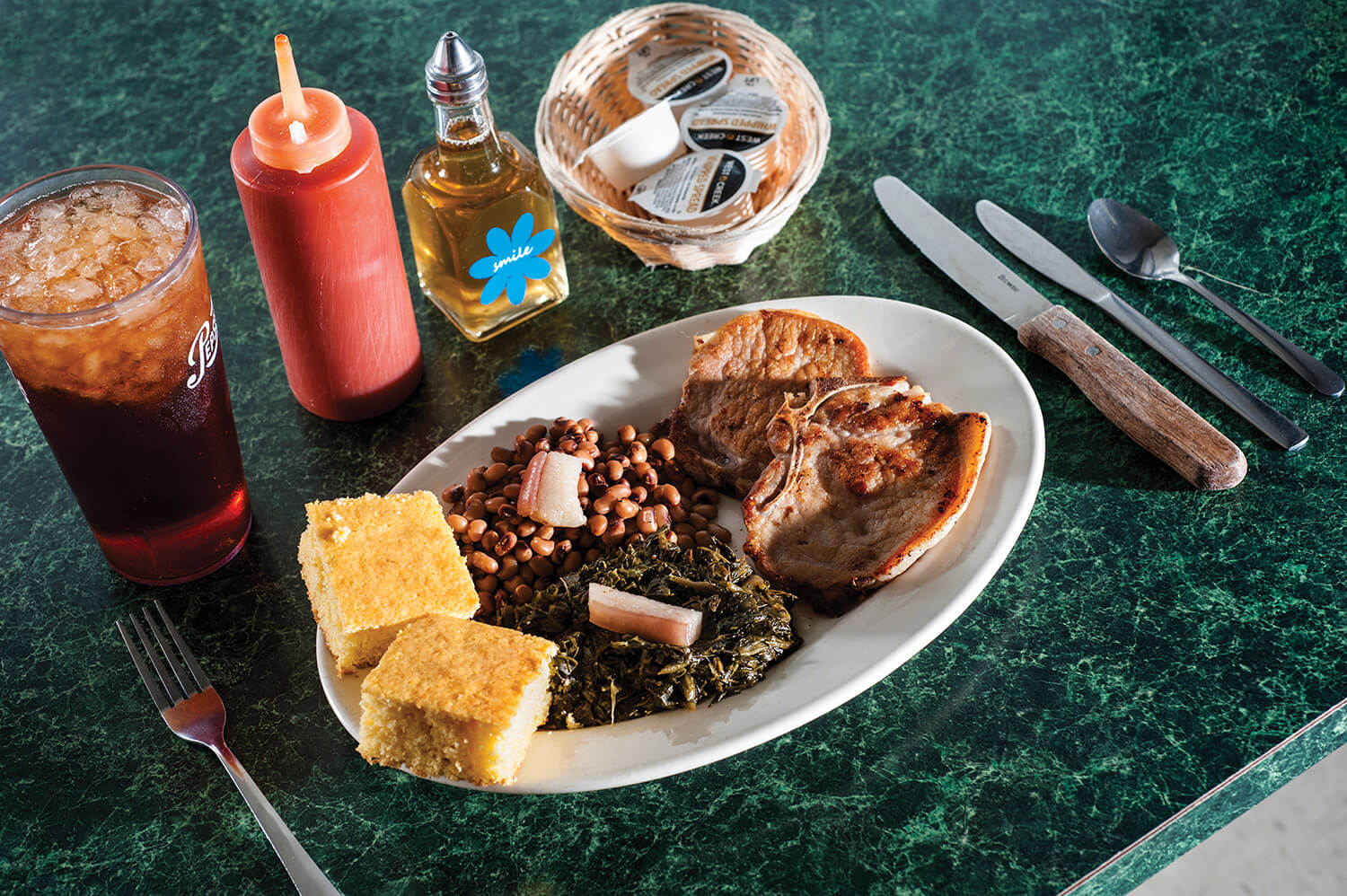 The New Year’s special at Legends Family Restaurant: cornbread, black-eyed peas, pork chops, and greens served up by co-owner Tara Kennedy. photograph by Andrew Craft