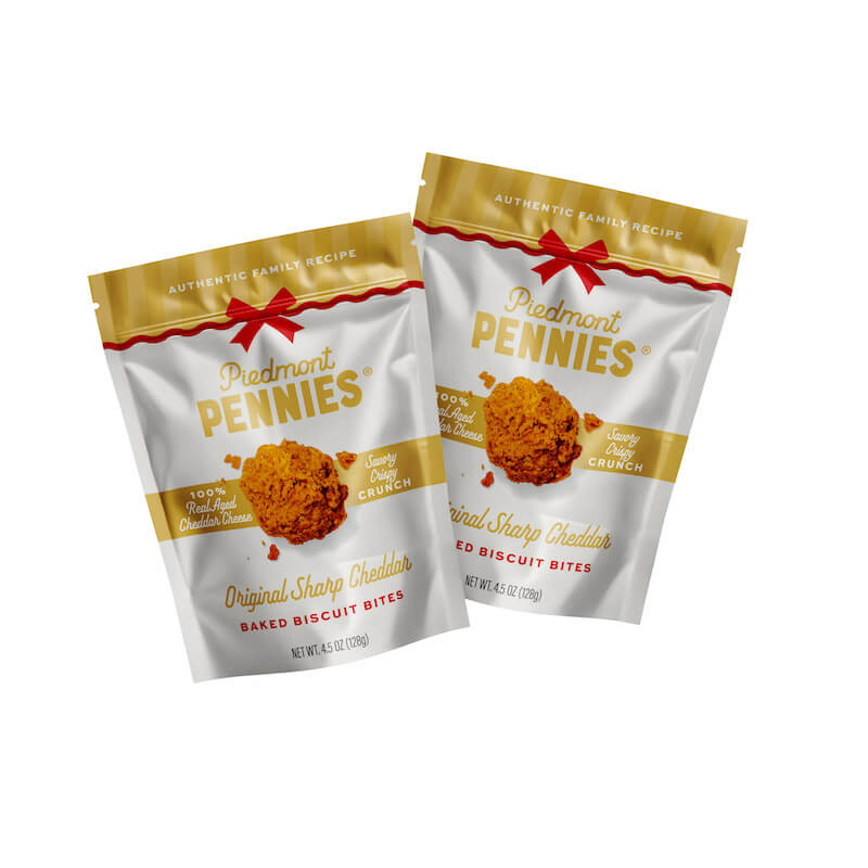 Food 4-Pack Holiday Package, Piedmont Pennies Cheese Straws Piedmont Pennies A Carolina family recipe turned crowd-pleasing snack, Piedmont Pennies are sharper, crunchier cheese straws. In festive red-bow packaging, they make
