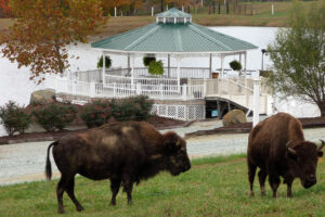 The tour through Jack and Sandy Pleasant’s 260-acre bison farm traverses rolling hills and picturesque farmland. At the helm of the wagon ride, Jack fields questions from passengers about the eight calves he started with back in 2001, and shocks his visitors with a story of the day he saw a bull jump 12 head-high gates. He reveals a little history about his Person County land, which has been in his family since 1797.