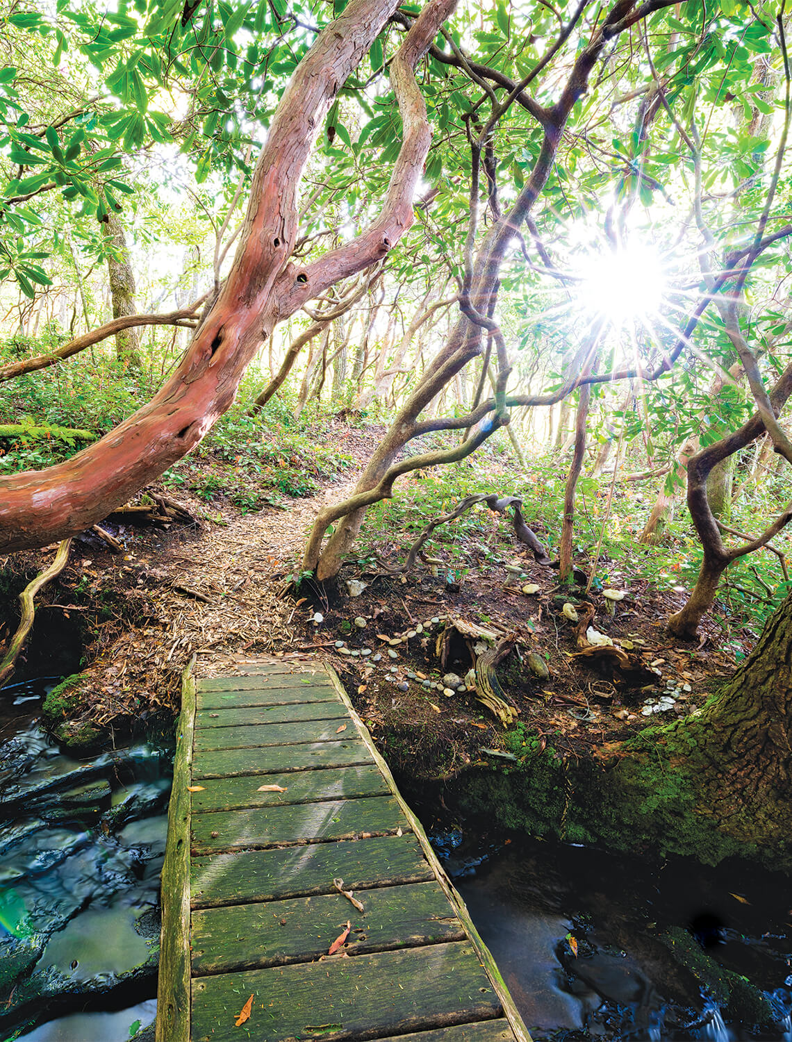 Local artist Jesse Morgan’s locust wood doorway blends seamlessly into a backdrop of cinnamon ferns and rhododendrons, while firecracker-red Major Wheeler honeysuckle happily winds itself up and over the threshold. photograph by Thomas Moors