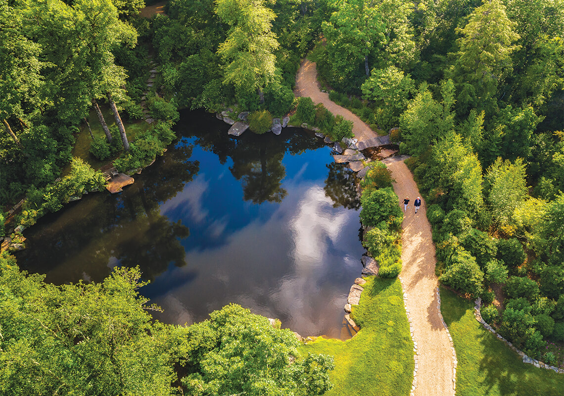 Surrounded by smooth rocks and soft beds of moss, Vaseyi Pond is both serene and vibrant, a magnet for all living things: Tree frogs, salamanders, turtles, dragonflies, and, of course, humans are drawn to its cool waters. The pond is named for Rhododendron vaseyi, or pinkshell azalea — one of the species delivered by glacier during the last ice age. Southern Highlands Reserve is known for its large collection of pinkshell azaleas, and when they bloom — often the first sign of spring in the winter-bare woods — “it’s like you’re walking through a pink cloud,” Holdbrooks says. “It’s magical.”