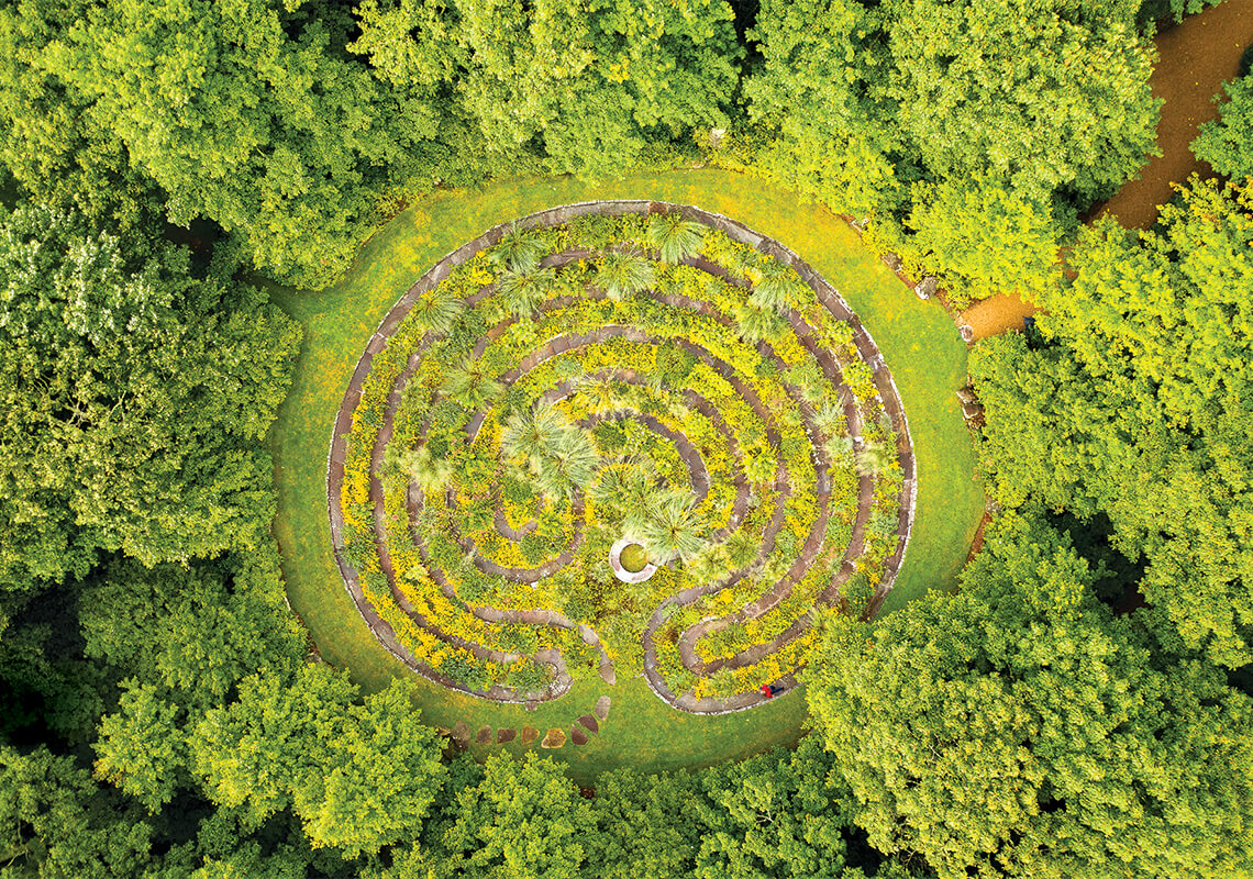 Throughout the labyrinth, ornamental grasses mixed with perennials create a sense of movement. When the wind blows, tufts of heavy metal blue switchgrass wave among golden patches of black-eyed Susans, coreopsis, and yellow false indigo. photograph by Thomas Moors