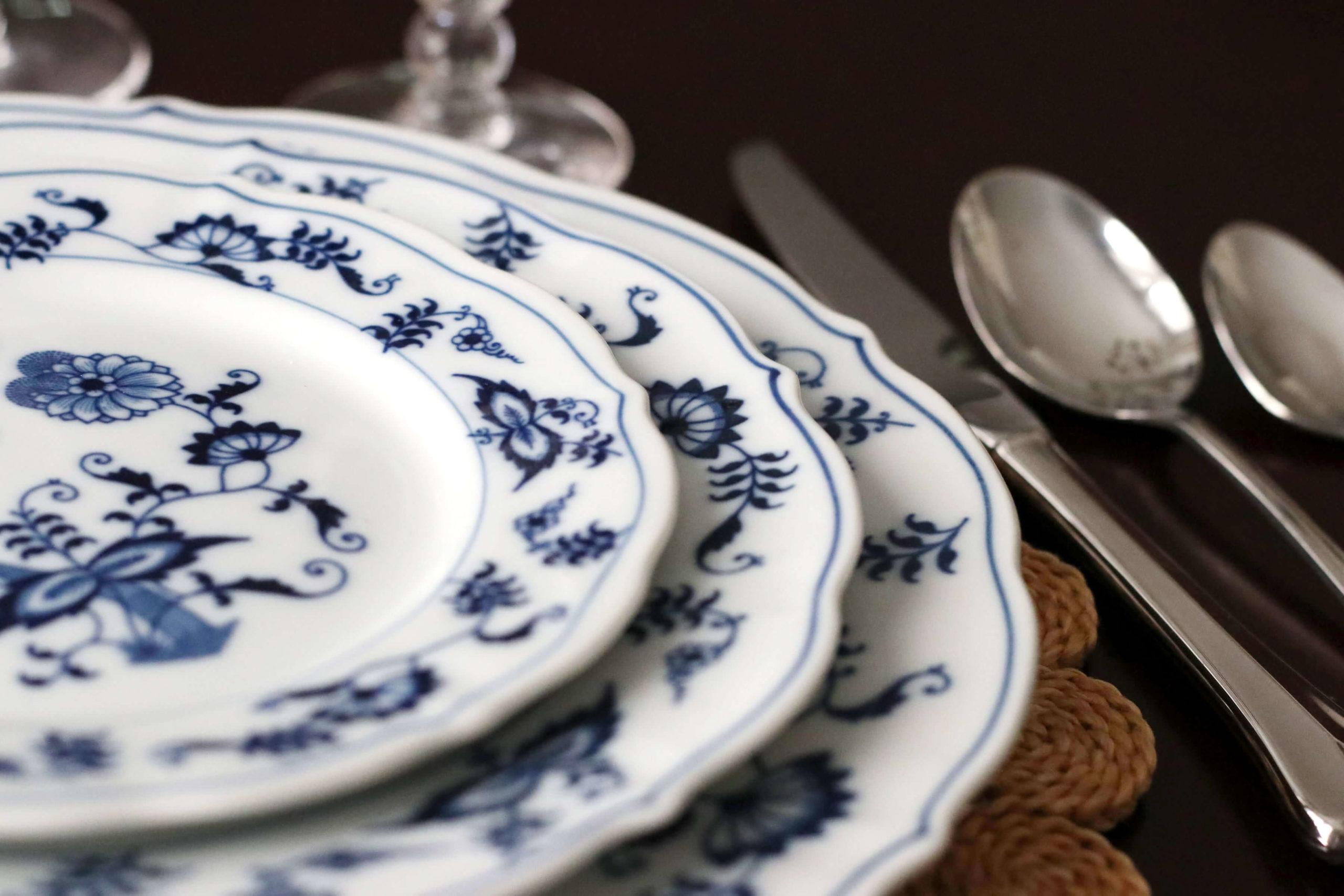 A set of china featuring the Blue Danube pattern was one of the few personal items the Truitt family always took with them, no matter where they moved. photograph by Replacements, Ltd.