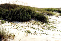 Its shiny leaves shed the salty water. Its running rhizomes send out roots into the loose soil. Its low height withstands high winds.