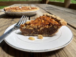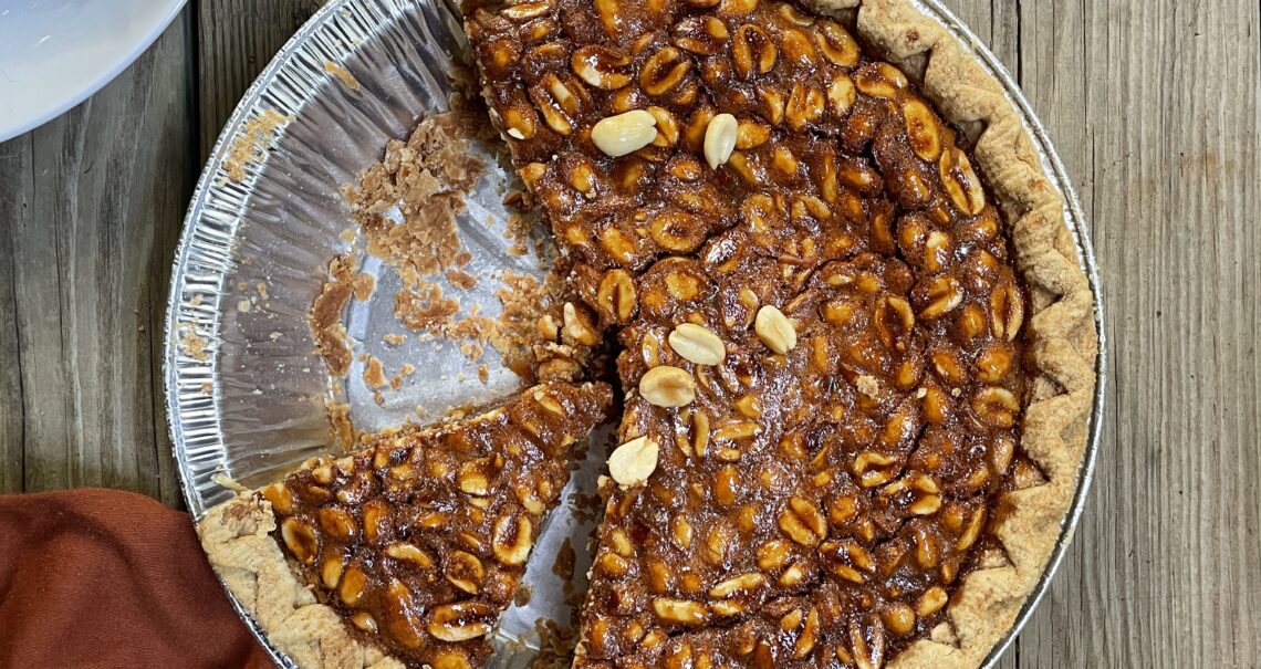 For the pie: Place eggs in a large mixing bowl and beat well until creamy and smooth. Add peanut butter, light brown sugar, and corn meal. Stir well to combine. Stir in the cooled Pepsi syrup. Add melted and cooled butter, stirring constantly. Add vanilla extract. Fold peanuts into mixture.