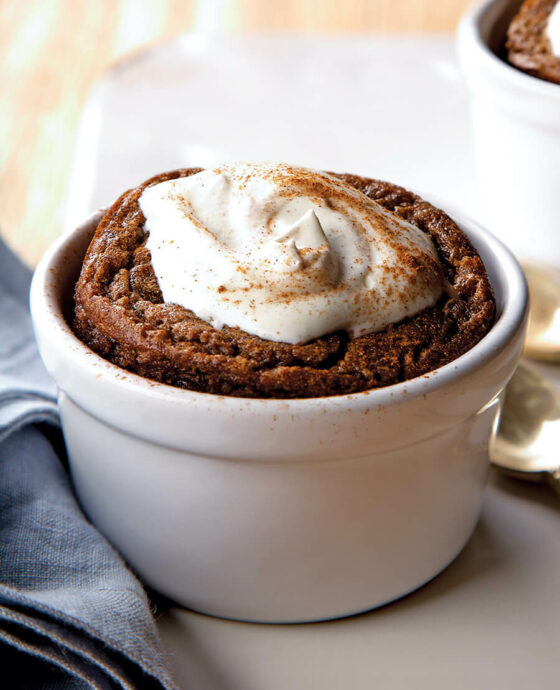 Pour batter into ramekins, filling almost to the tops, and place on a baking sheet. Bake for 45 minutes or until edges pull away from the sides and centers are just firm. Pudding will fall slightly after being removed from the oven. Serve with whipped cream and a dusting of cinnamon.