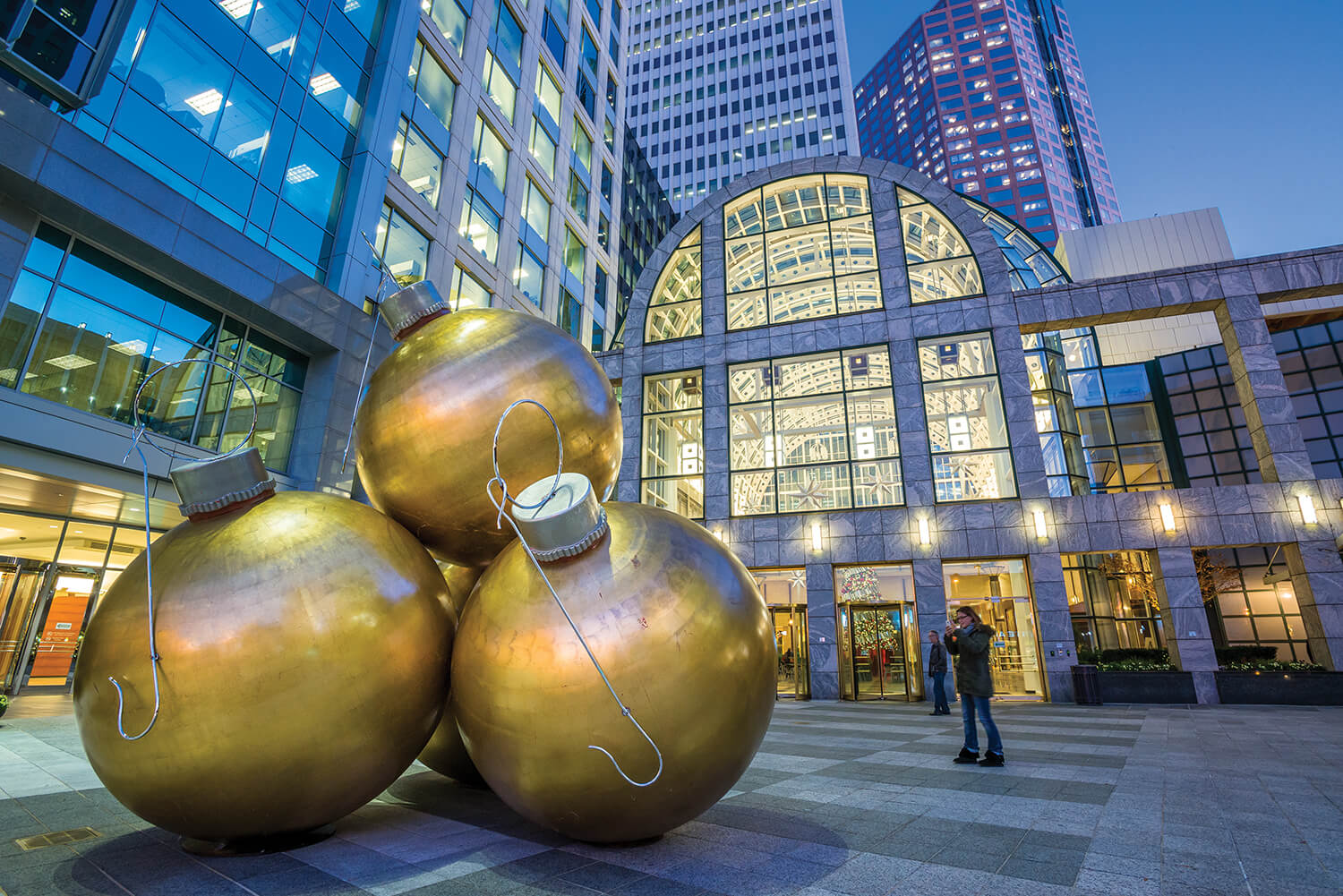 Decorations hit the literal big time outside the plaza of Two Wells Fargo Center in Uptown. Stop by for a selfie; everyone looks good with gold.