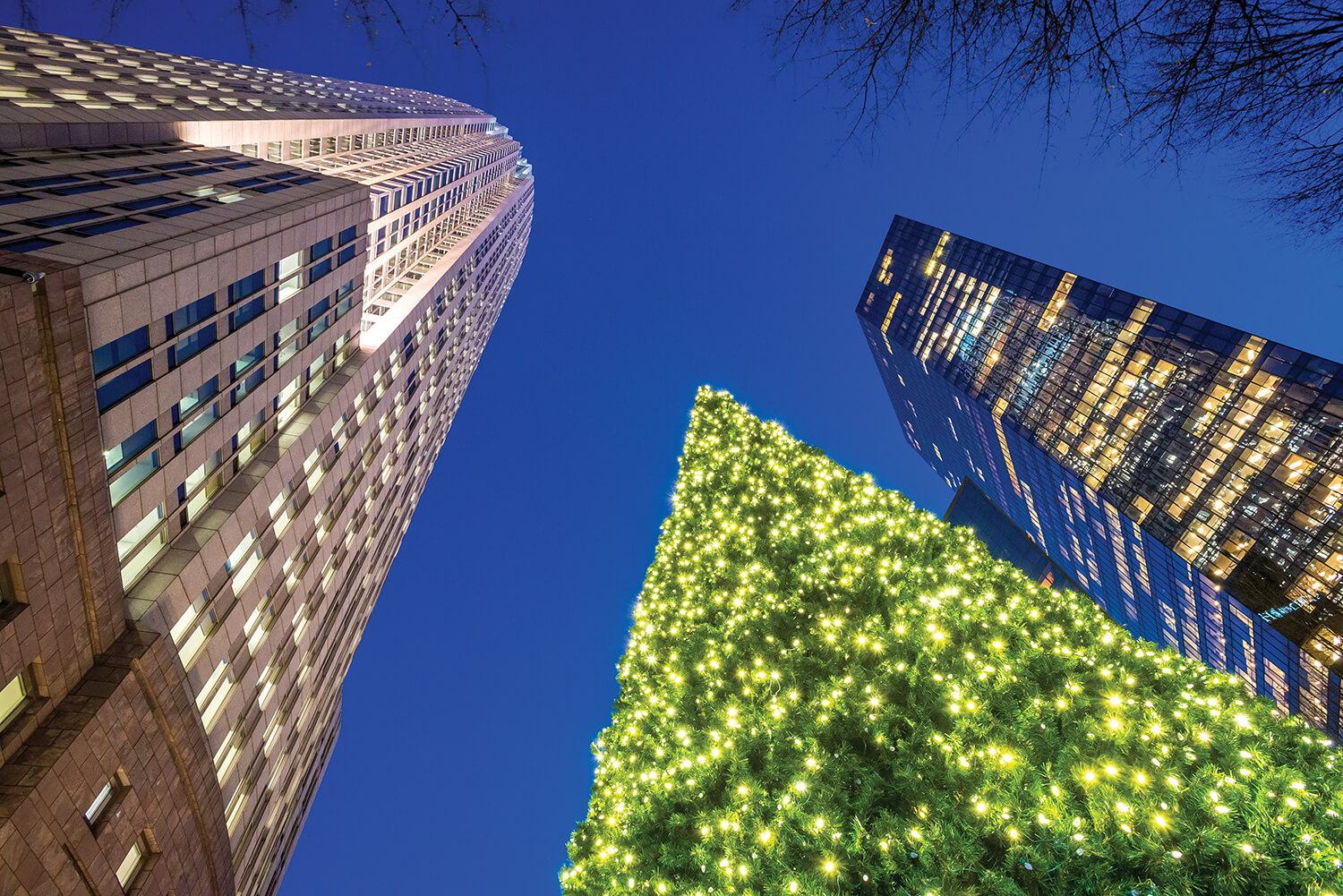 At the intersection of Trade and Tryon streets, a festive tree reaches for the heavens along with neighboring skyscrapers. Dwarfed in height, but not in beauty, its soft glow illuminates a city’s silent night.