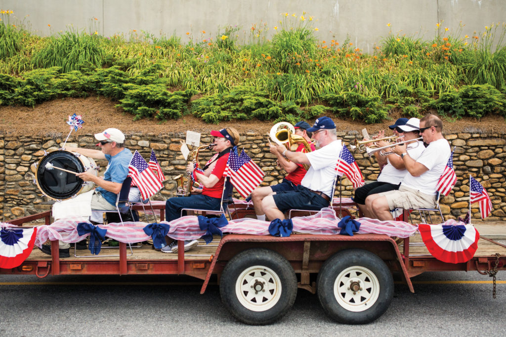 The Haywood Community Band is a fixture in an eclectic Fourth of July parade featuring classic cars, golf carts, fire trucks, and floats decorated to reflect a yearly theme.