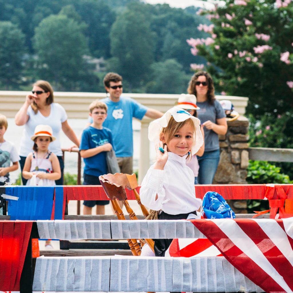 Lake Junaluska’s first Independence Day parade was held in 1978, but the community’s affection for Fourth of July festivities goes back even further: As early as the 1950s, families celebrated the Fourth with games on the athletic field, an organ recital, a community sing, and a fireworks display. Some of the activities have changed over the years — in addition to fireworks and a “family Olympics,” there are balloon artists, face-painting, and inflatable bounce houses — but the spirit of patriotism and community involvement is as strong as ever, especially for parade participants like Isaac Robinson (below). As the parade proceeds down the mountain, spectators are often inspired to join the fun, meaning that there are almost as many people in the parade as there are watching it.