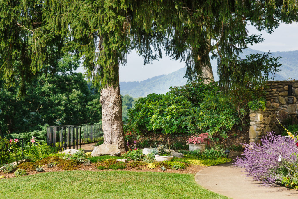 At Inspiration Point near Lambuth Inn, a lush, two-level garden overlooks the lake and the mountains beyond.