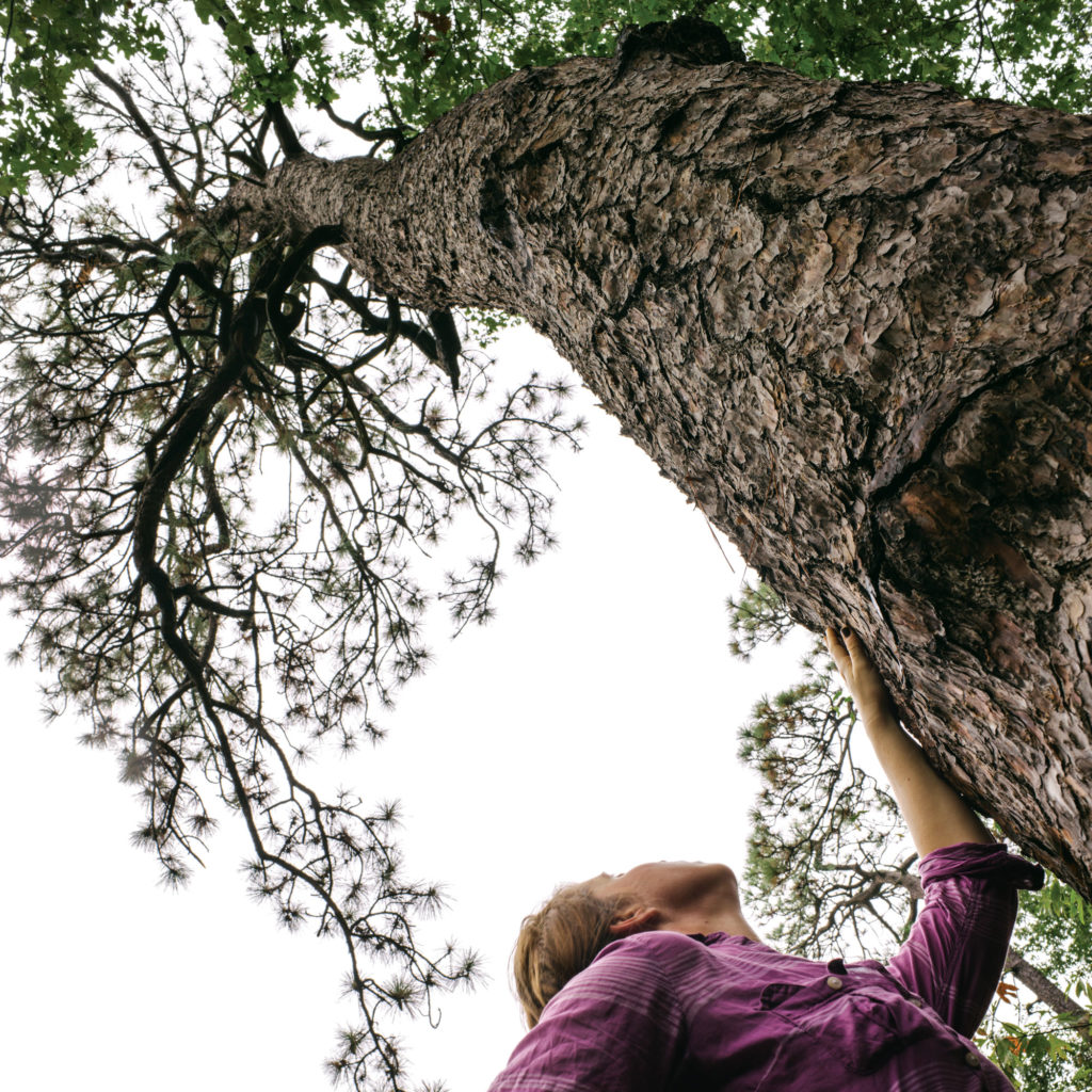 Conservation Coordinator Gretchen Coll (below) of The Nature Conservancy stands next to the oldest known longleaf pine — 468 years old — in the Boyd Tract of the Weymouth Woods-Sandhills Nature Preserve near Southern Pines. This region used to be covered by an extensive longleaf pine forest spanning hundreds of miles in every direction. The tree was the source of the prized “heart pine” used for furniture, ships, and floors, as well as a major source of turpentine. Remnants of unlogged longleaf dot the South, but managing these tracts is tricky and expensive. The longleaf needs periodic fire and long-term management to reproduce and thrive.
