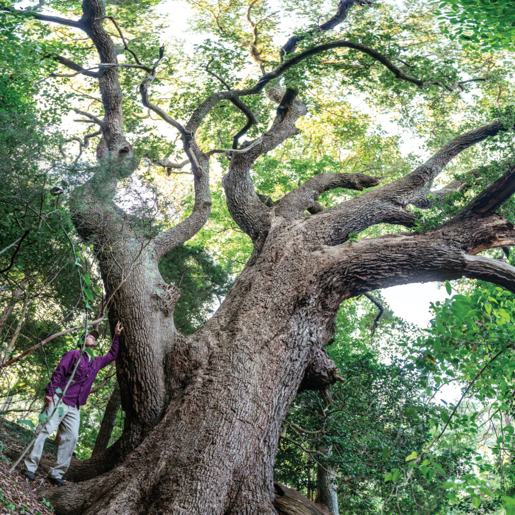 Aaron McCall (below), The Nature Conservancy’s northeast regional steward, communes with an ancient live oak in an unmarked section of the Nags Head Woods Ecological Preserve. The shelter provided by two dune systems protects the hardwood forest from heavy weather and salt spray, creating ideal conditions for long-lived hardwoods and a mix of evergreens.