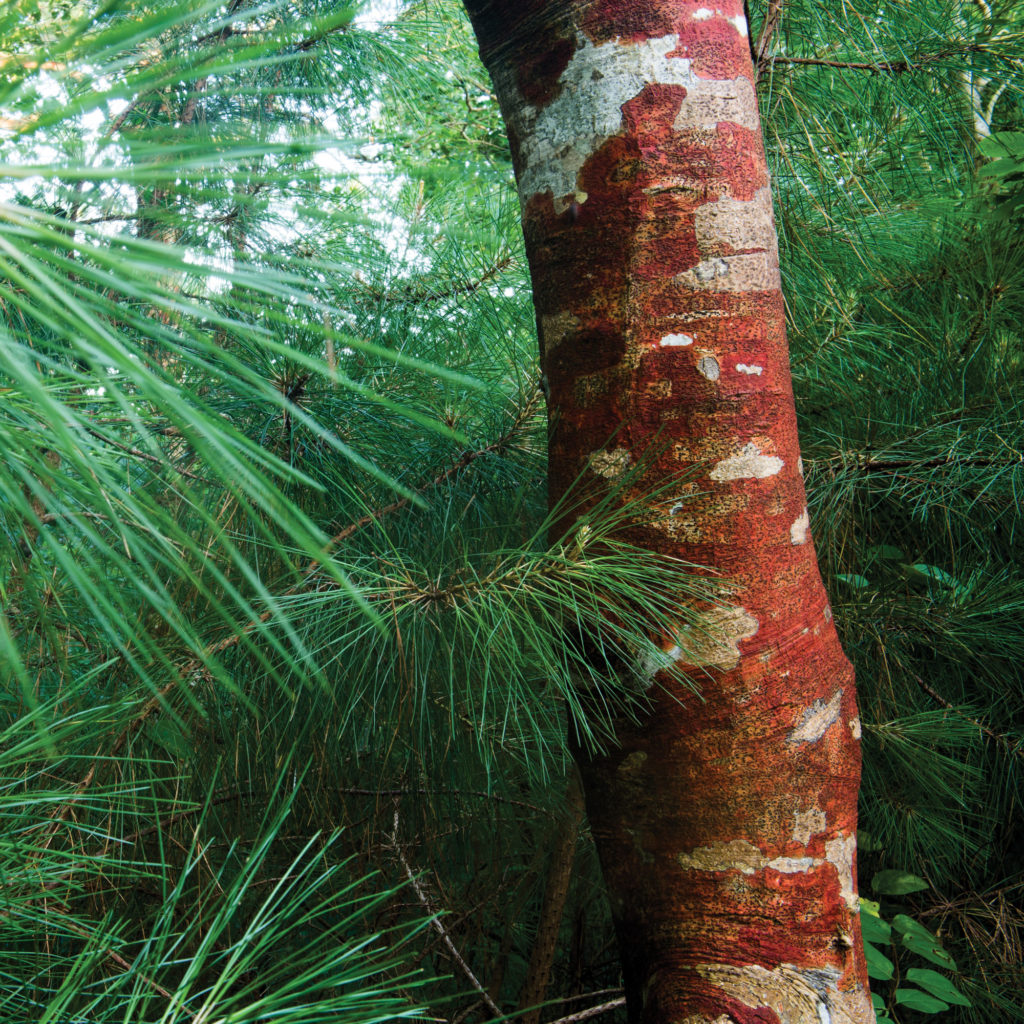 Red lichen marks smooth areas of bark on an American holly tree below, which stands among the pines at the Nags Head Woods Ecological Preserve. Two ancient dune systems shelter about 1,200 acres of protected maritime forest here, creating an ecosystem of old-growth hardwoods, freshwater ponds, swamp forests, and brackish marsh systems. Nags Head Woods is one of the three major maritime forests on the Outer Banks.