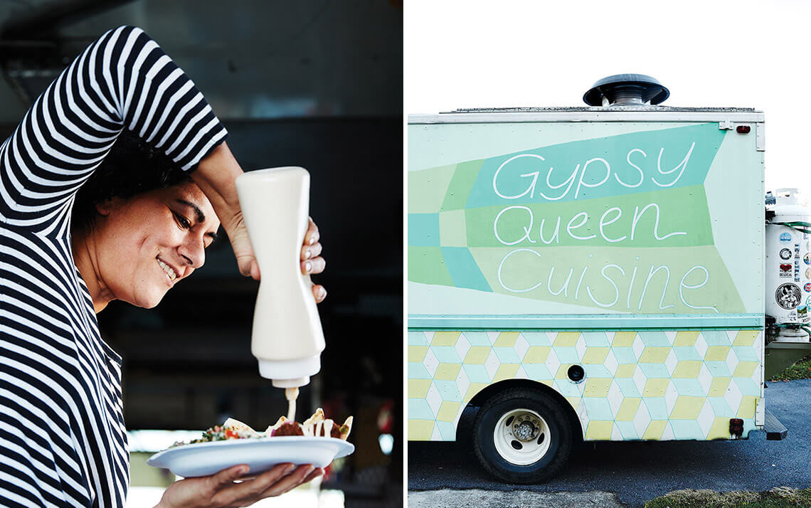 Suzy Salwa Phillips left Lebanon at age 15, and now, in freewheeling Asheville, her food truck (and brick-and-mortar deli) serves up authentic Lebanese food, from kale-and-lentil soup to chicken shawarma. If you think you don’t like cauliflower, you haven’t had it Lebanese-style — fried, and served with “mighty toum” (left), an aioli-like sauce of garlic, lemon, oil, and salt, that’s the ranch dressing/cream cheese frosting of Gypsy Queen Cuisine: It makes whatever it coats taste heavenly.