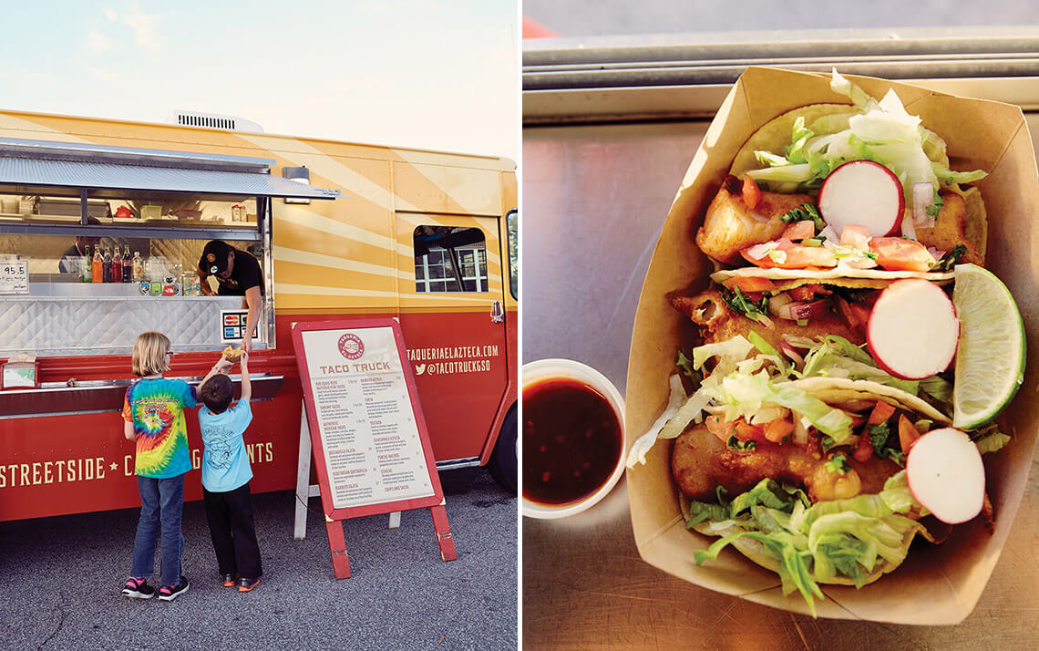 Chef Tara Diamante writes the menu board for her food truck in fluorescent colors — take a look; the vibrant pinks and greens match the food. Diamante and her chef/fiancé, Brenton Ebersold, met at Johnson & Wales University. Both are dedicated to local sourcing, and another menu board explains where every ingredient originates. Here, Peruvian pork belly tacos are served in the ubiquitous paper boat.
