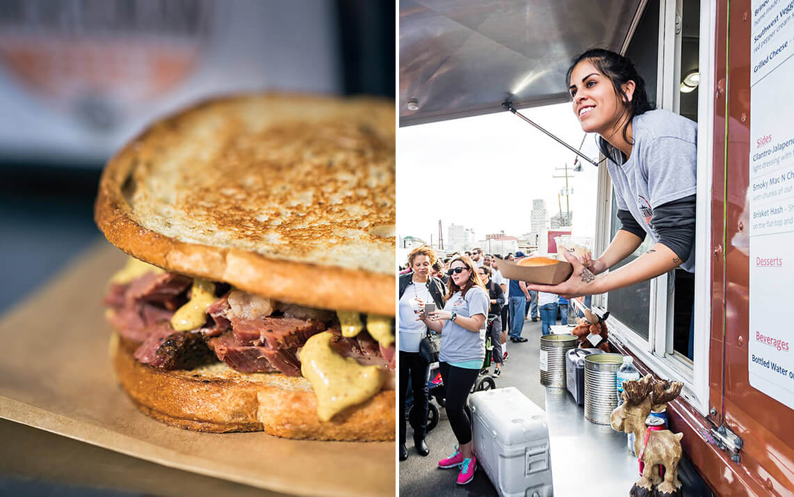 “I’ve been on mission trips, and this is the best jerk chicken I’ve had outside Jamaica,” a customer claims. What tends to run out first, though, is the “Montreal-style” smoked meat sandwich, with brisket that’s been cured for days, then boiled with coriander to produce a red, pastrami-like meat. No wonder another customer says, “I drove 30 minutes for this.” At right, Arrika Martinez serves it up.