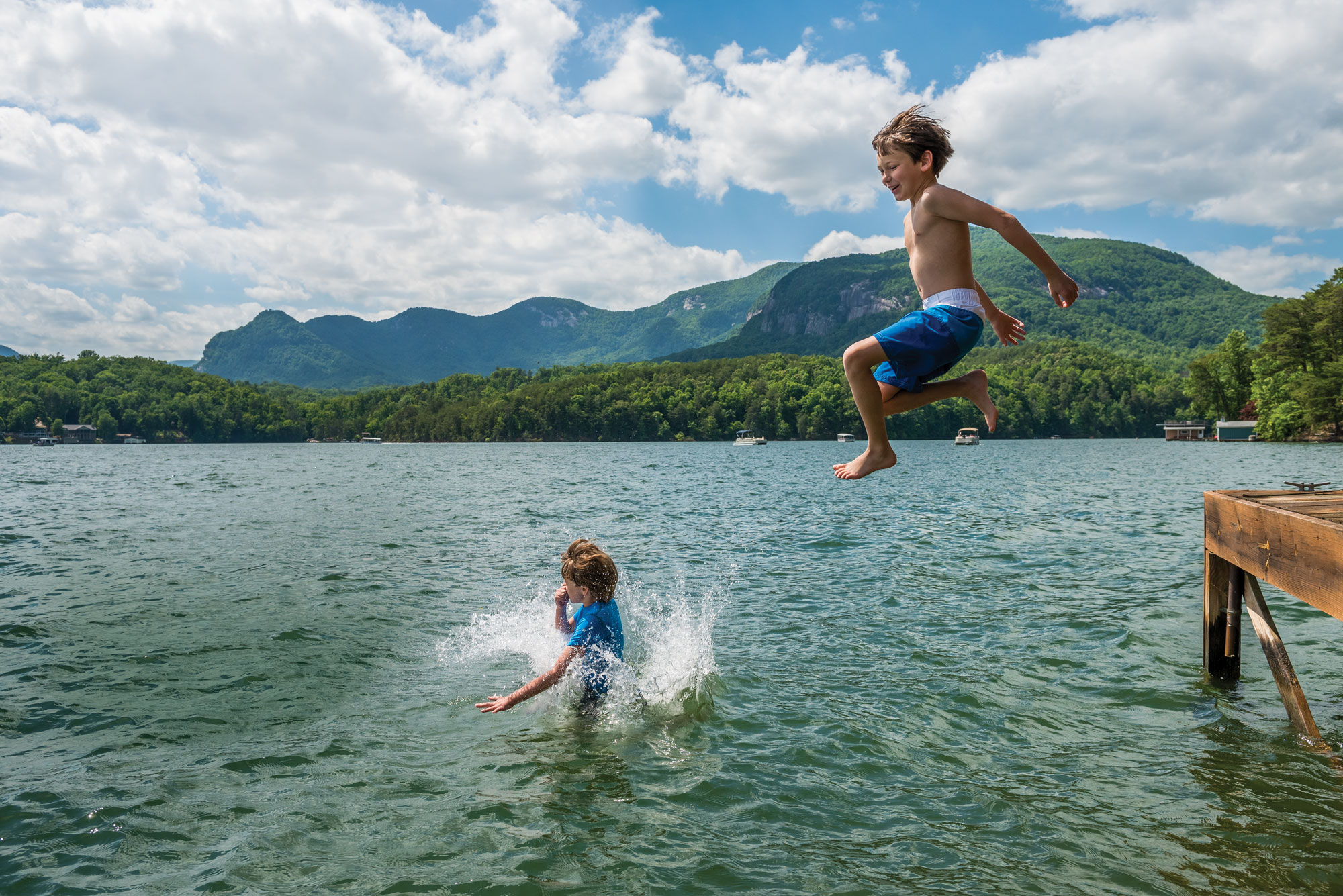 His grandparents’ dock will do nicely as a launchpad for Jackson Yelton (in air) and pal Adler Knight. At Lake Lure, “A pontoon is more important than a ski boat,” says resident Kenneth Tanner, a grandson of an original investor/developer, for “tie-up” gatherings on the water. photograph by Emily Chaplin